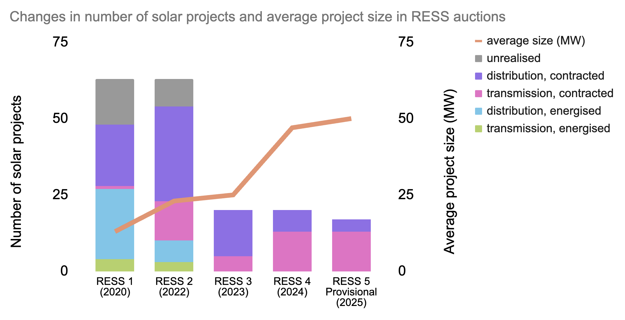 Another key finding when we compare results from all five RESS auctions is how the type of solar projects has changed. As shown above, when we look at the number of projects, the first three auctions were dominated by distribution-level solar farms, which tend to be much smaller in size compared to transmission-level projects. In fact, average solar project size in RESS 1 was 13MW and that increased to 50MW in the most recent RESS 5, due to the fact that a much greater share of projects plans to connect at transmission level.