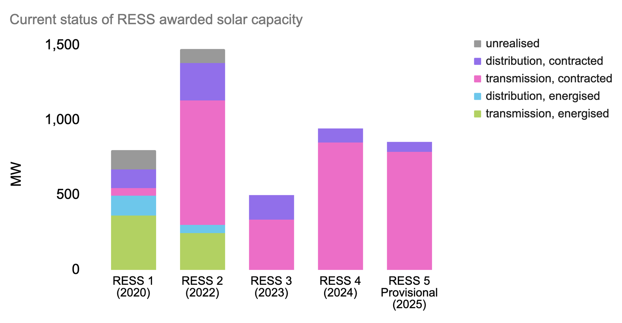 As expected, all capacity awarded in more recent RESS auctions falls under the contracted category, so examining the status of RESS 1 and RESS 2 provides more insights. Capacity awarded in RESS 1 needed to achieve commercial operations by the end of 2023 and that deadline for RESS 2 is December 2025. To date, 16% of RESS 1 capacity has been determined as unrealised and 6% for RESS 2.