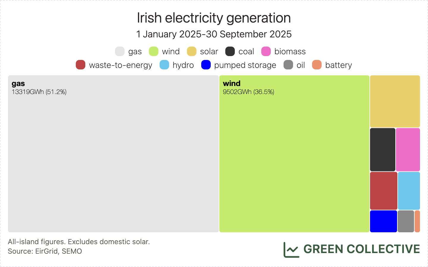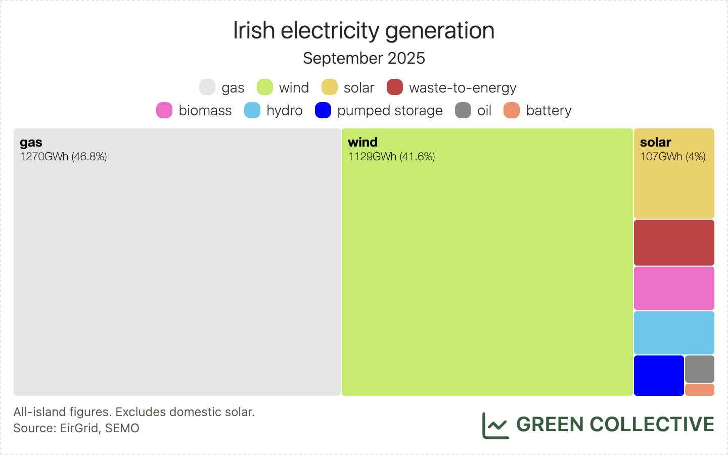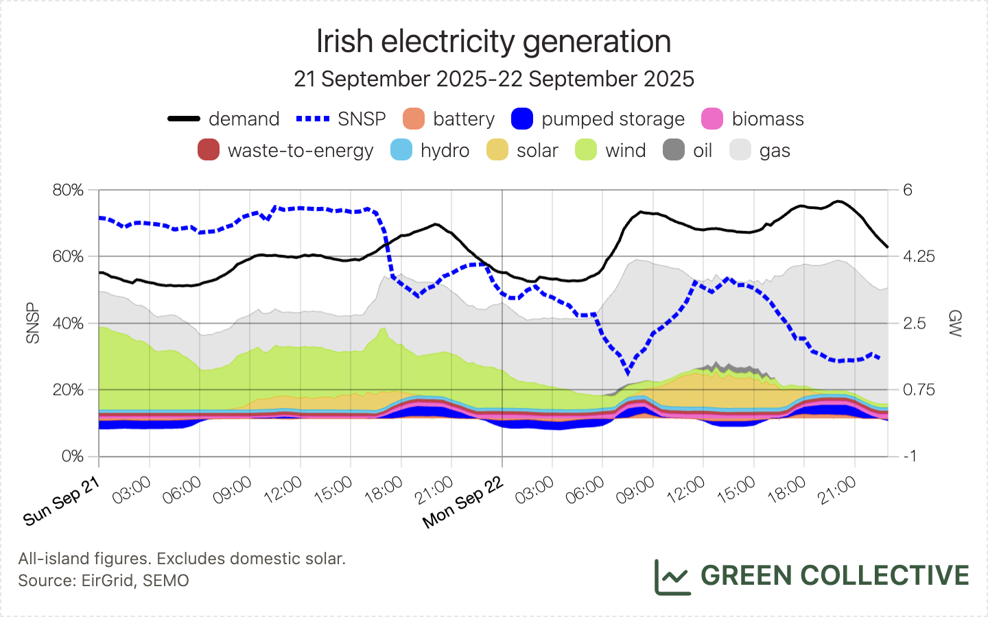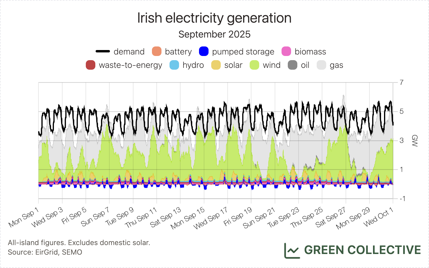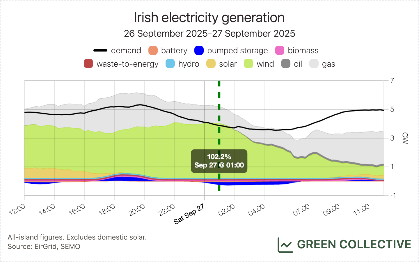 On the morning of Saturday, September 27, we saw renewable generation briefly exceeding 100% of all-island electricity demand, peaking at 102.2% of demand. This is still rare outside of the winter: we saw it in August and September 2023, only during the winter in 2024, and now again in both August (we forgot to mention it in last month's newsletter) and September 2025.