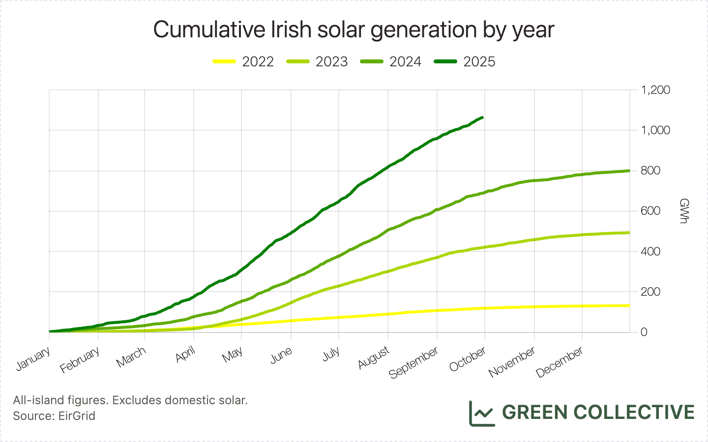 On September 8, all-island solar production for 2025 exceeded 1TWh. This is the first time Ireland has seen 1TWh+ in a single year. Eyeballing the cumulative chart below, it looks like 2025 will finish with approximately 1.2TWh; this would represent a roughly 50% year-on-year increase from 2024.