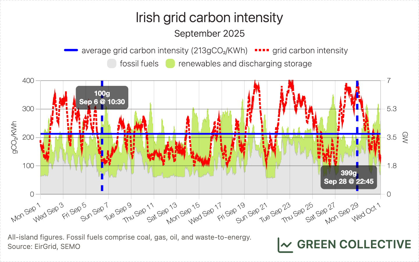 We estimate that during September 2025 the Irish grid emitted approximately 575,000 tonnes of CO₂, emitting for each kWh of electricity generated between 100g and 399g of CO₂ for an average grid carbon intensity of 213gCO₂/KWh.