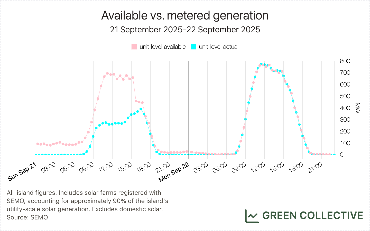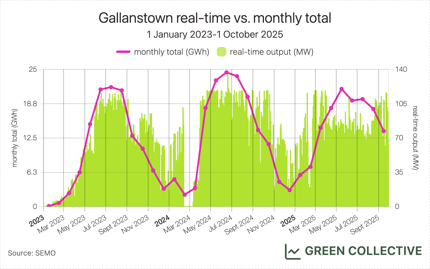 That said, it's still striking that we didn't see any solar records during August. Why not? As noted several times in this newsletter this year, some of the island's largest solar farms have not been producing as much power as they did during the summer of 2024. Gallanstown, for example, has been peaking at approximately 80MW for most of the summer – well below the 120MW it regularly reached last year. However, in recent weeks, we have finally seen both it and nearby Gillinstown reaching full capacity.
