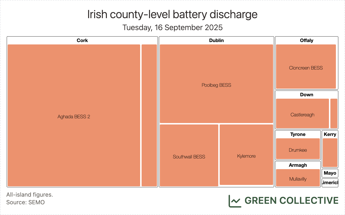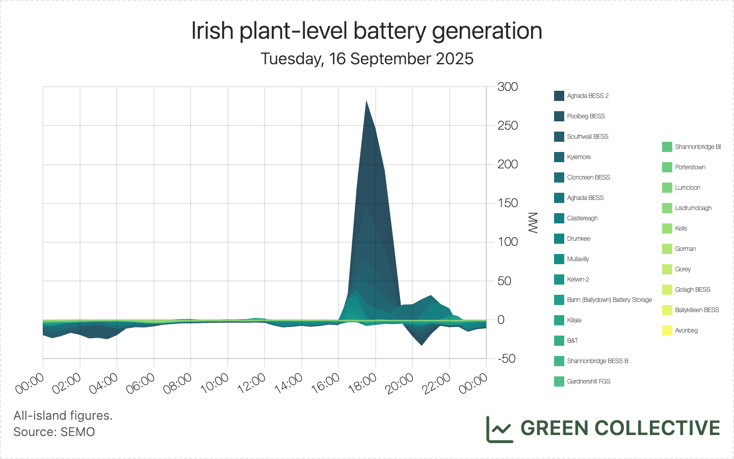 On Tuesday, September 16, battery discharge on the Irish grid reached a new all-time high of 275MW, finally beating the previous record of 266MW set all the way back in January. Together with Turlough Hill, storage discharge was equivalent to approximately 9% of all-island electricity demand at that time. Cork's pair of Aghada plants were key here, accounting for about half of discharge, and Dublin's duo of Poolbeg and Southwall along with Kylemore accounting for most of the other half.