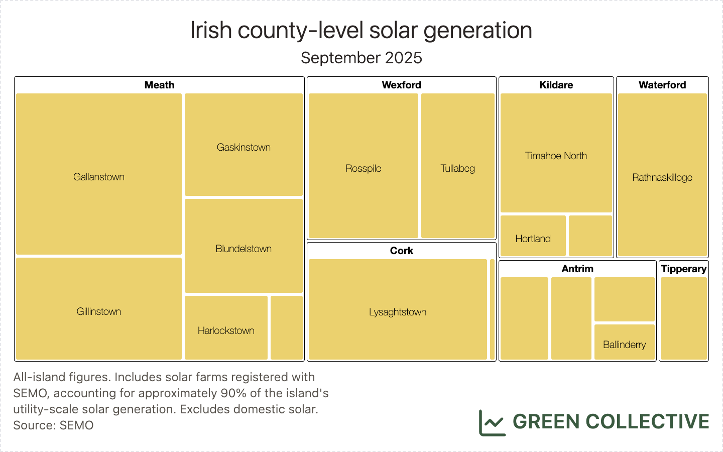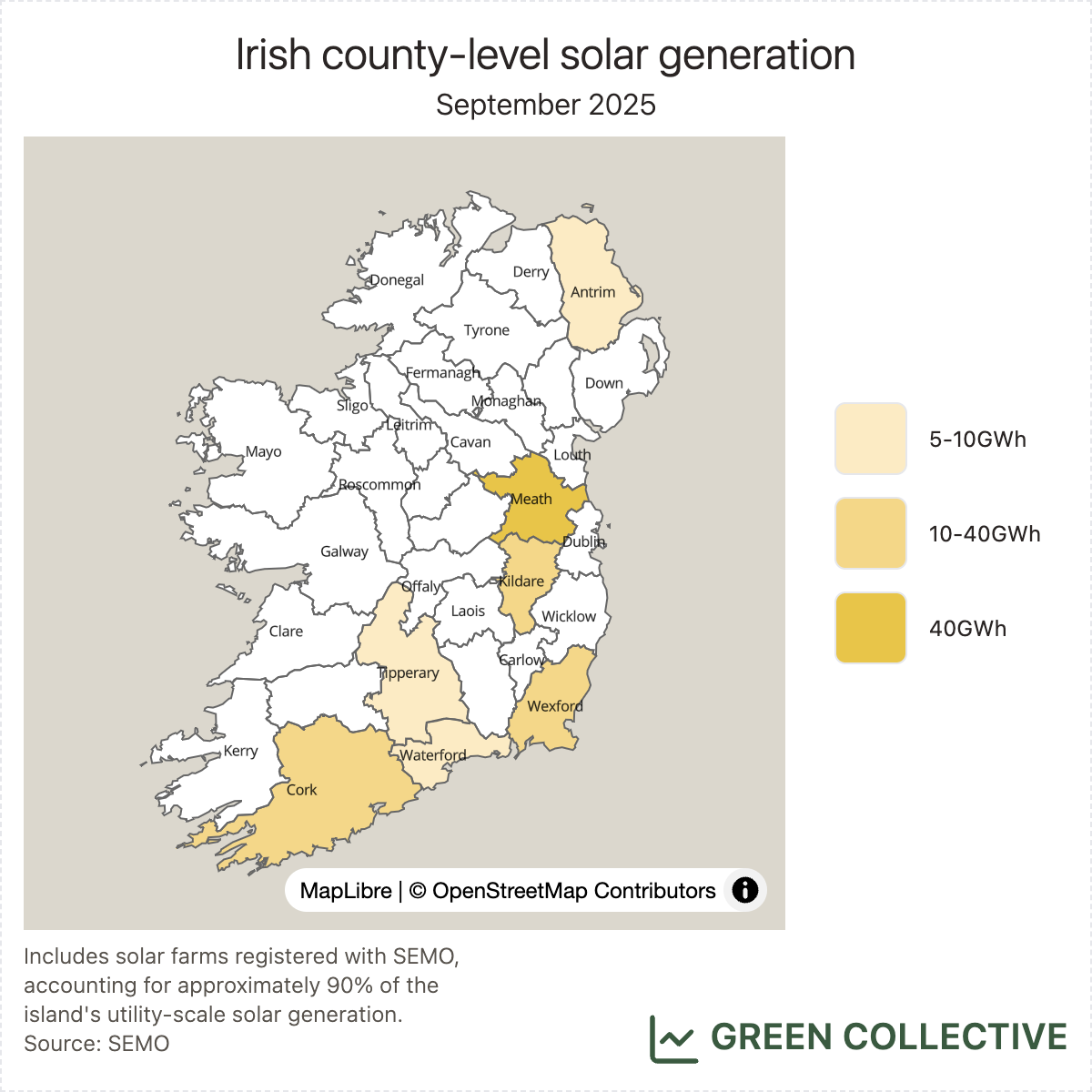 Meath remains the clear leader in Irish solar with at least 1/3 of production taking place there. Wexford maintains its long-term streak as distant #2. In September, Cork was back to #3, having been ousted in August by Kildare. Cork's Lysaghtstown was back at full strength this month and, as the second-highest producing solar farm on the island, it's more than enough to compensate for Kildare's new Dunmurry Springs PV which we're happy to report that in only its second full month of production has been reaching its maximum capacity of approximately 12MW.