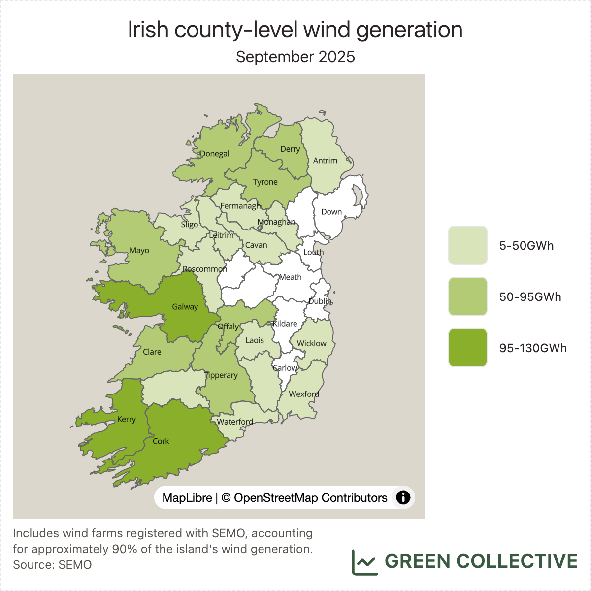 Kerry held onto top spot again during September after having been briefly dethroned by Cork during July. Galway and Mayo are also regulars in the top 5, although this month we note that Mayo's total is, for the second month in a row, significantly behind Galway's. For the second month in a row – and for only the second time ever – Derry appears in the top 5, this month reaching #4. As noted above, Offaly's Yellow River Wind Farm has had a prolonged outage which, combined with Derry's new Corlacky Wind Farm (which during September started exporting its maximum capacity of approximately 45MW), has lately propelled Derry into the #5. However, with, as of the last few days of September, Yellow River's roughly 100MW slowly ramping up again, this may well change in October.