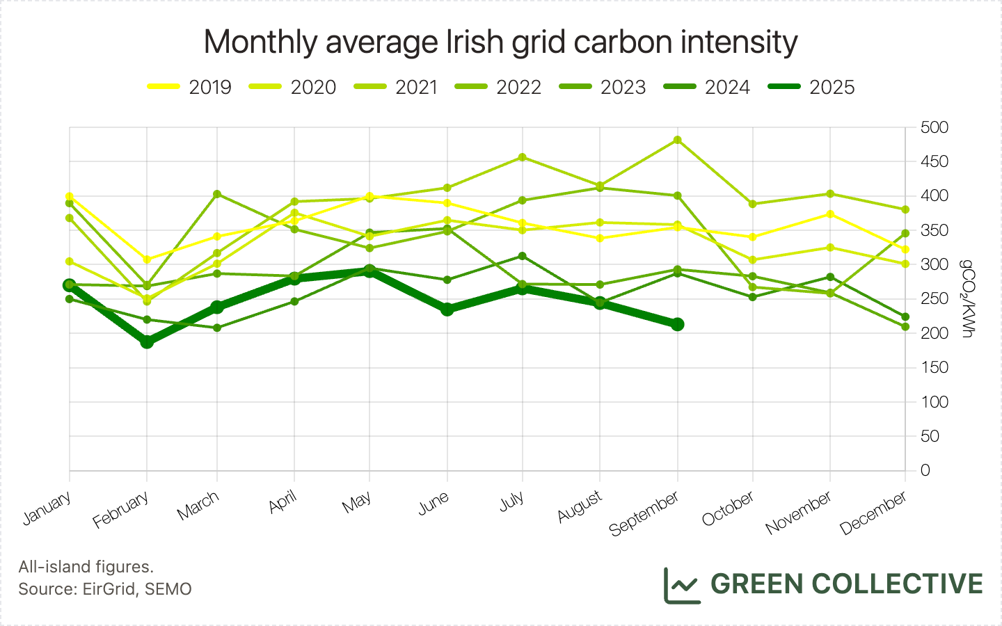 This was the lowest amount of carbon ever emitted by the Irish grid in one month, just beating June's 595,000 tonnes. 2025 is the first year we've seen carbon emissions dip below 600,000 tonnes in one month and it's now happened three times in three different seasons: February, June, and September.