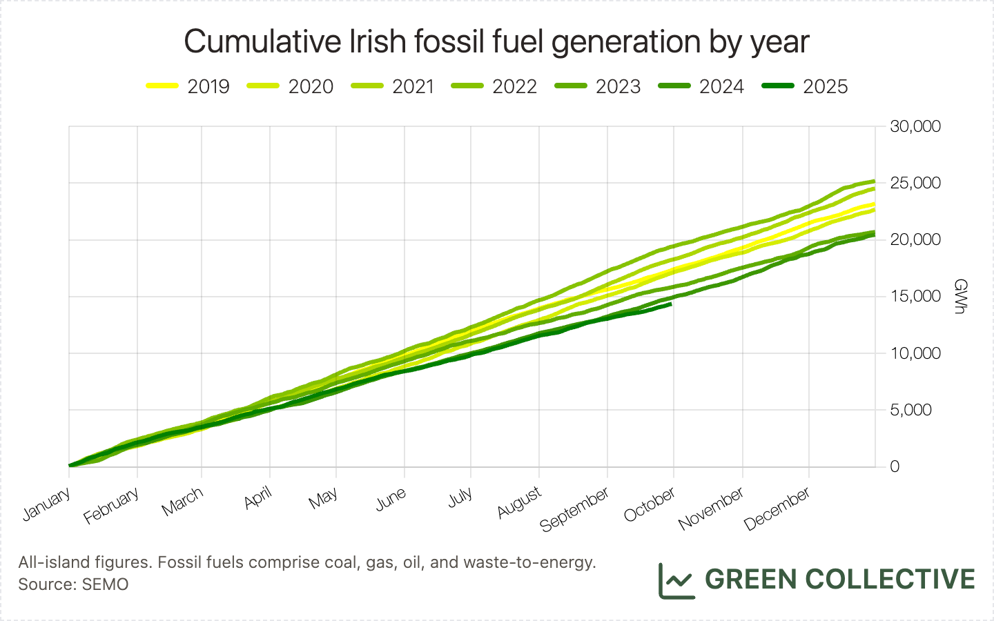 So far in 2025, renewable generation has equalled 37.2% of all-island electricity demand, fossil fuels 47.1%, and imports 14.9%. In terms of TWh, 11.4TWh from renewables is the most yet seen in one year by the end of Q3 while 14.4TWh from fossil fuels is the lowest yet seen in any year by the end of Q3. Comparing the past several years of fossil fuel generation, we can see it has fallen approximately 20% since 2019.