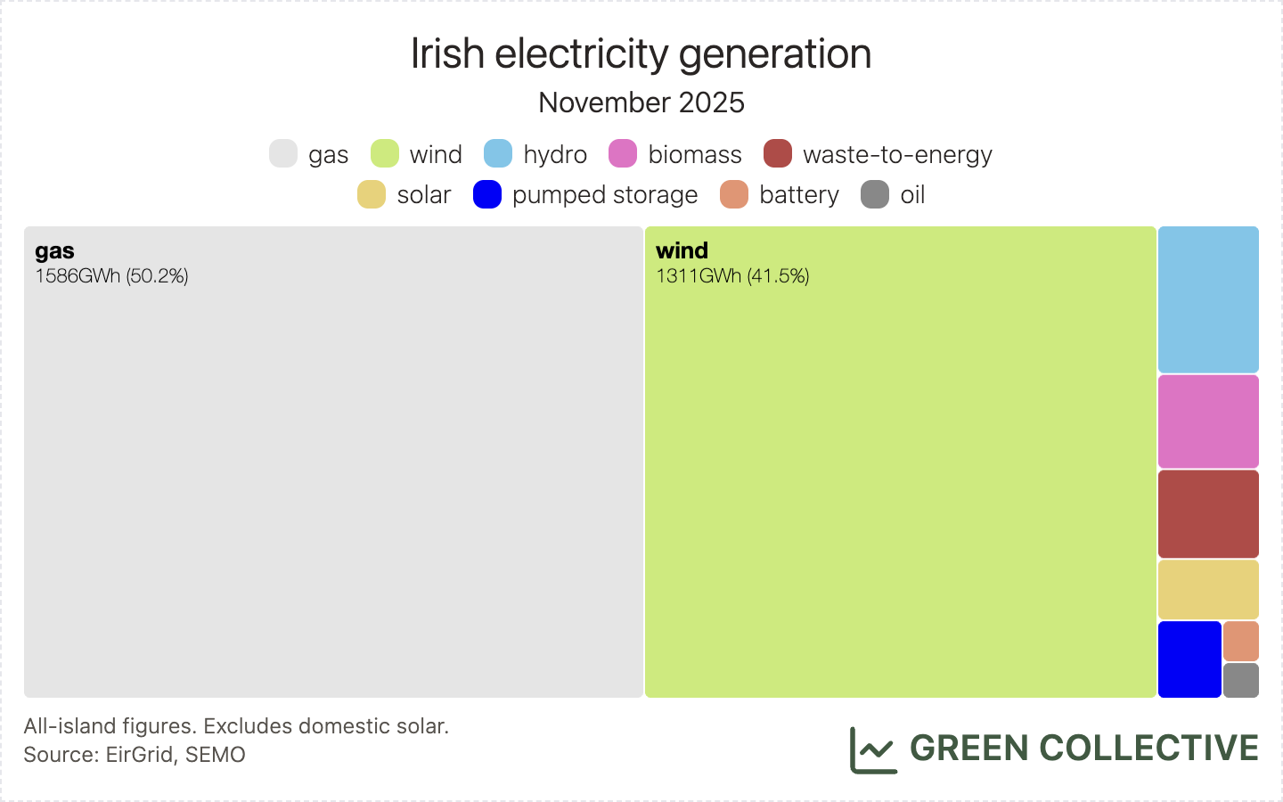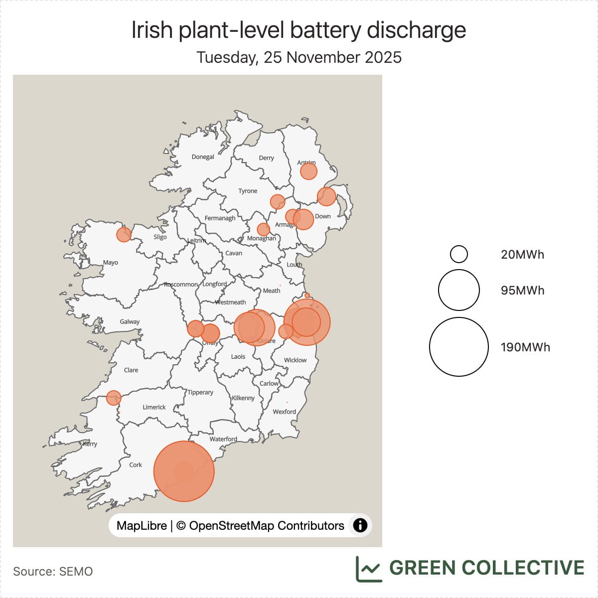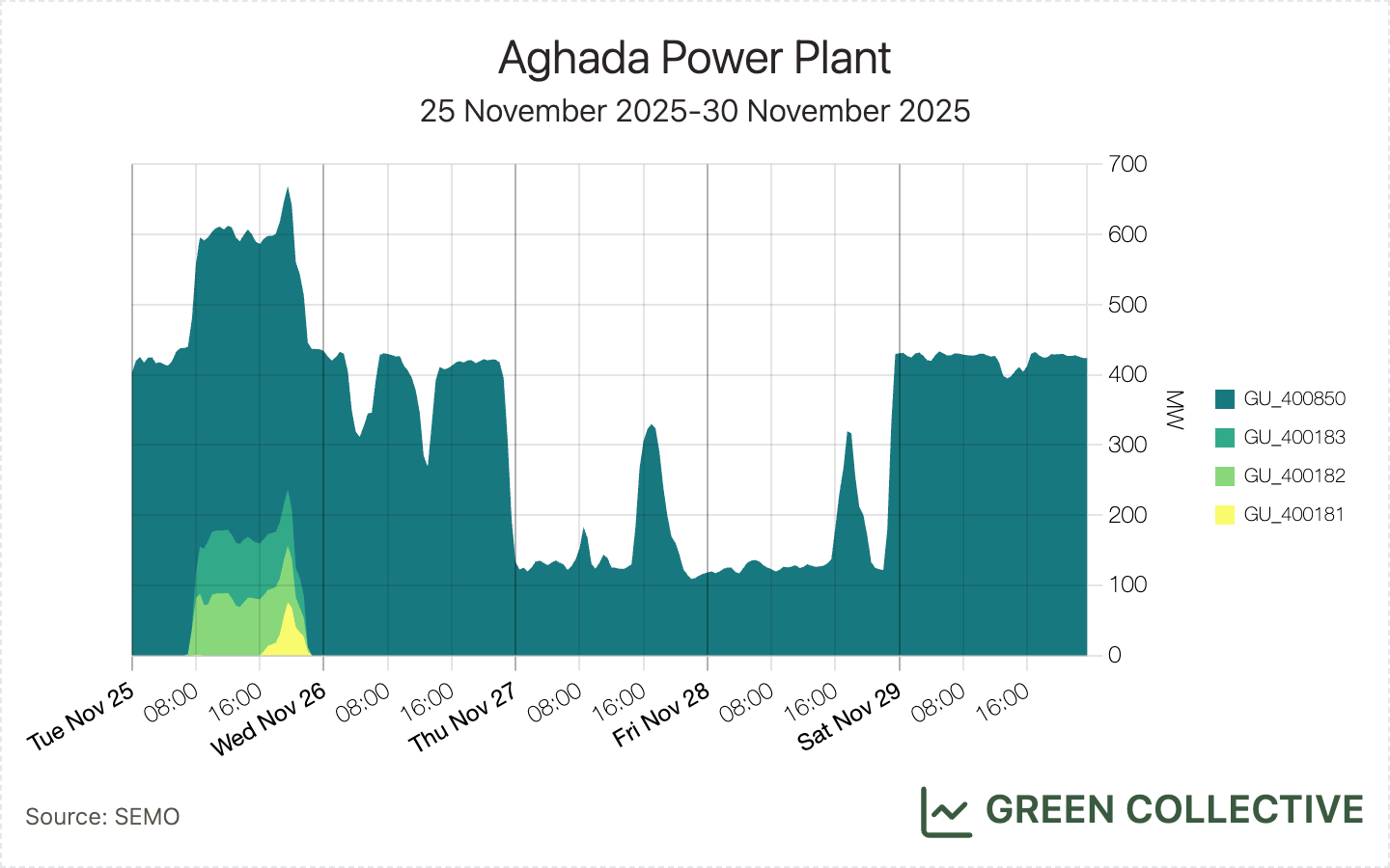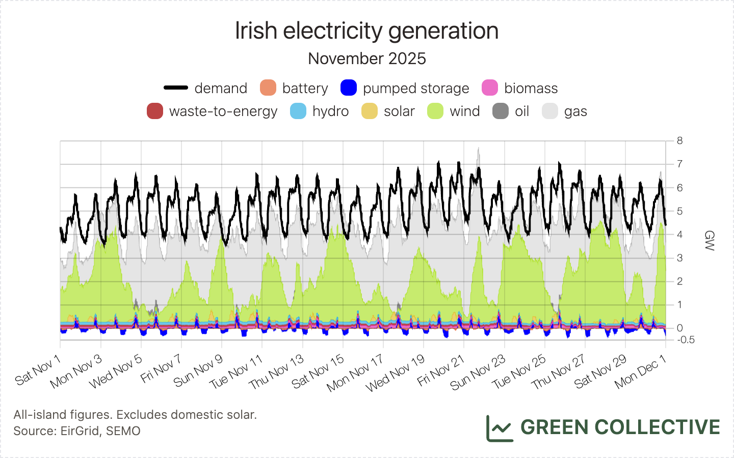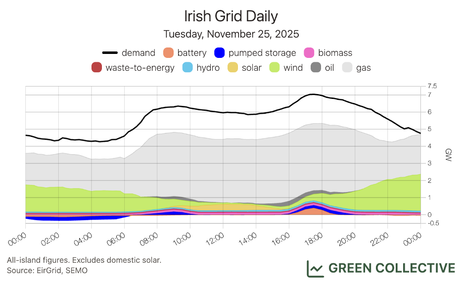 So, our best guess is a gas unit and quite possibly a re-assignment of an existing one given the time of day it went into operation. Having cycled laboriously through every gas unit on the island, Cork's Aghada plant stands out: its three older gas units all turned down around 11pm on November 25 and haven't been active since. However, the mystery unit is so far outputting much less power than any of those three units – and we haven't read anything about a change of ownership at Aghada. For now, this mystery unit fortunately doesn't much impact any of our analysis elsewhere in this newsletter. As always, if you know more than we do please reach out to us on hello@greencollective.io.