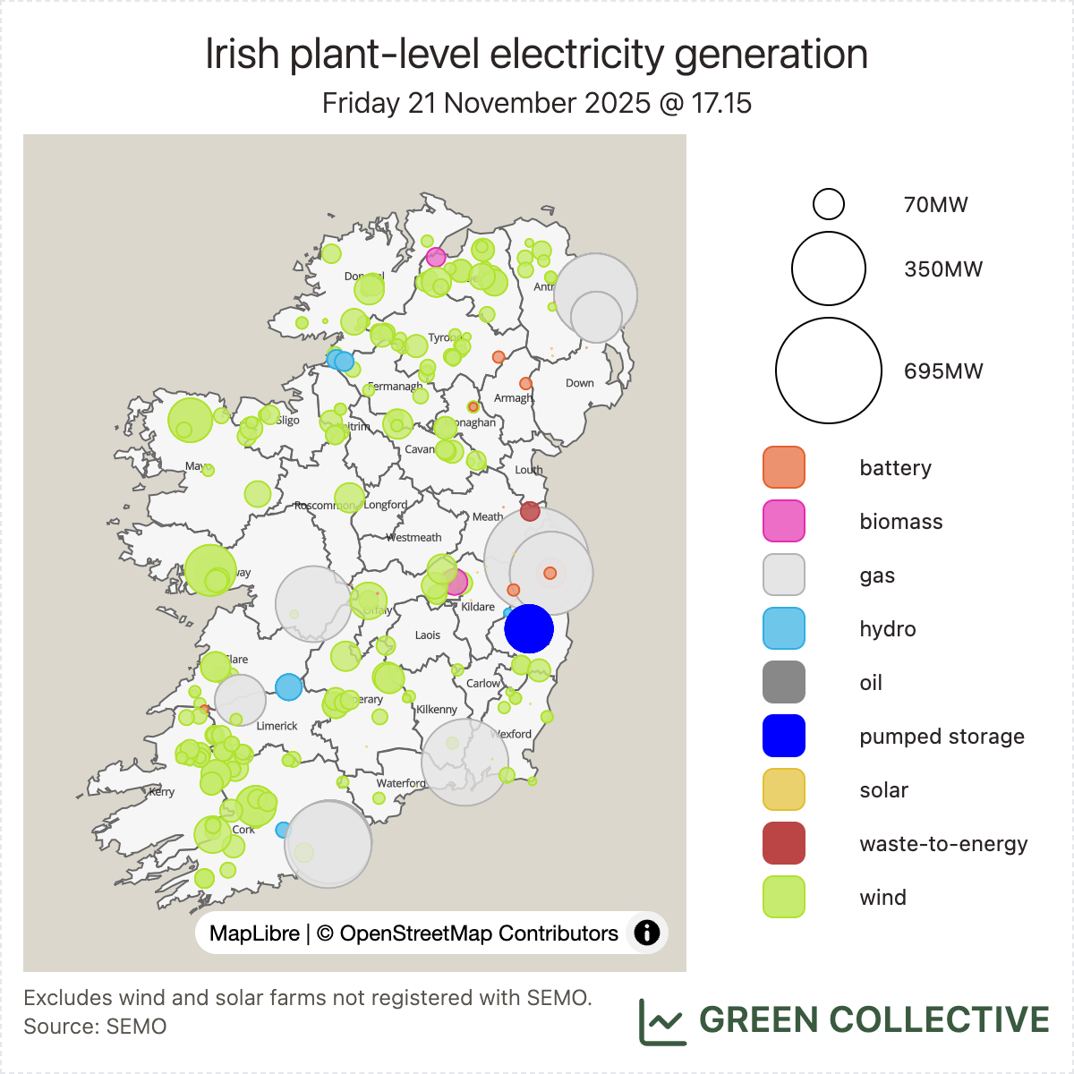 Although total generation was low, cold weather on November 21 helped spur a new all-time output high across the island: 7774MW, beating the previous record of 7712MW set in February. Below is a map of all large-scale generation at that moment; as the size and number of the grey circles suggests, winds were only medium-strong at the time.