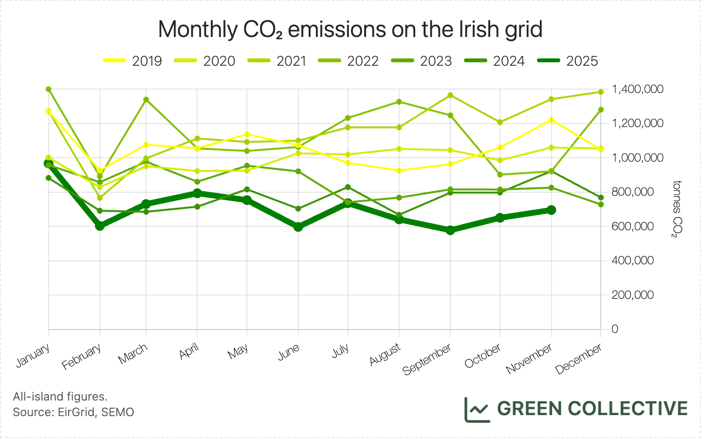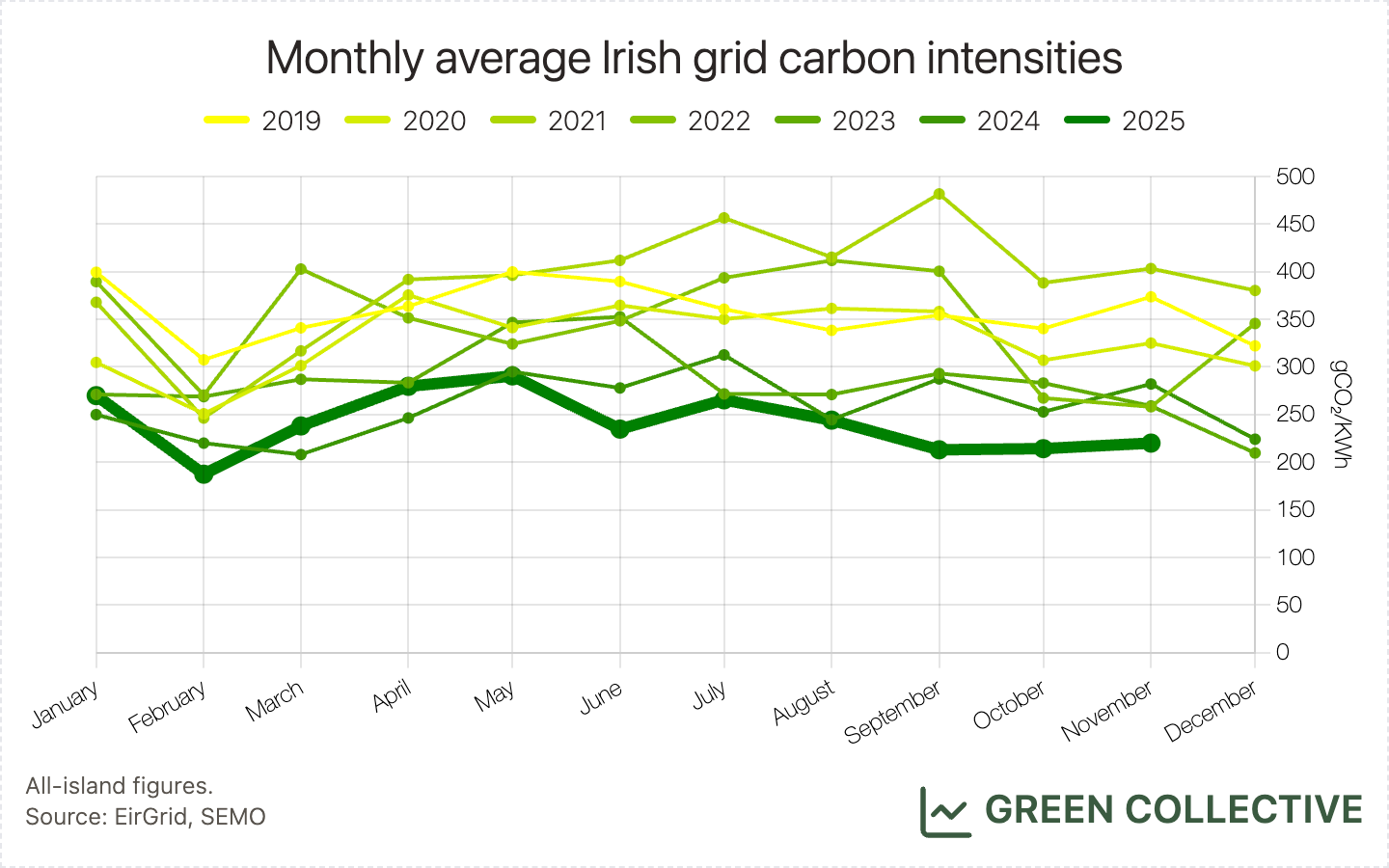 This was the lowest GCI for a November month by some distance, beating 2022's 258gCO₂/KWh. It was also the lowest amount of carbon yet emitted by the Irish grid in a November month, beating November 2023's 825,000 tonnes.