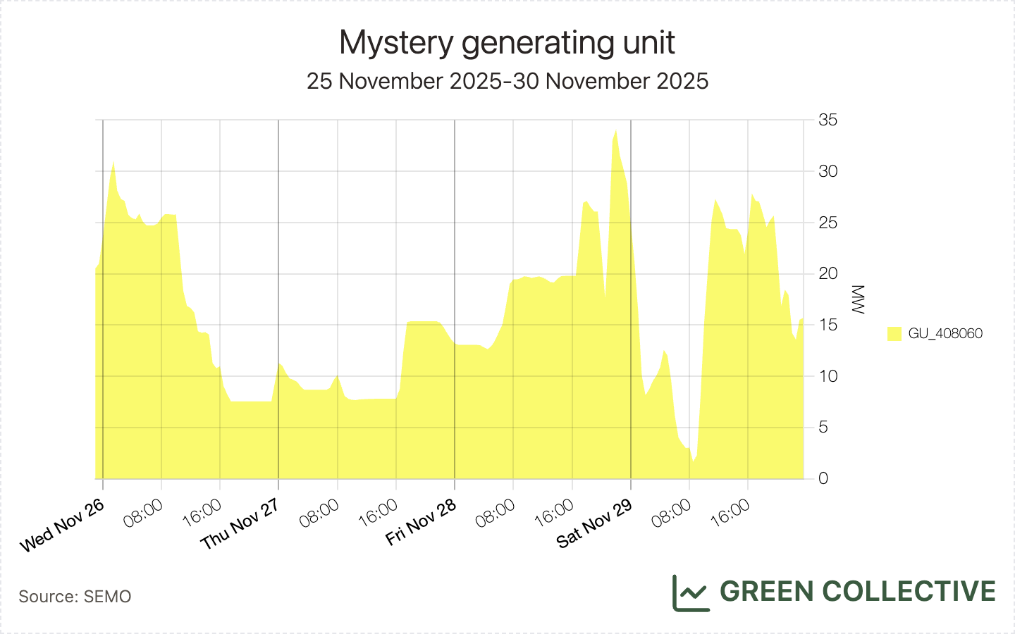A new, mystery unit appeared in SEMO's metered generation on November 25. This isn't unusual and isn't usually a concern because units typically arrive in the database several days if not weeks (or, in the case of Drombeg Solar, months) ahead of their first export to the grid but this one went right to 30+MW before SEMO had a chance to update their index.