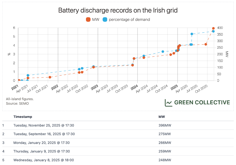 Based on metered generation data, battery discharge reached 396MW at 17:30 on November 25. The chart below shows the full history of battery records on the Irish grid. We saw a flurry of records last winter, shortly after revenue potential from the DS3 Programme (ancillary services) reduced for batteries, nudging more BESS to discharge during peak hours and earn revenues from energy arbitrage. On November 25, we saw more batteries participate in wholesale trading than ever. The jump from less than 300MW to around 400MW demonstrates the impact from the SDP_02 update already. As always, you can follow Irish grid records in real-time just like we do via our records dashboard.