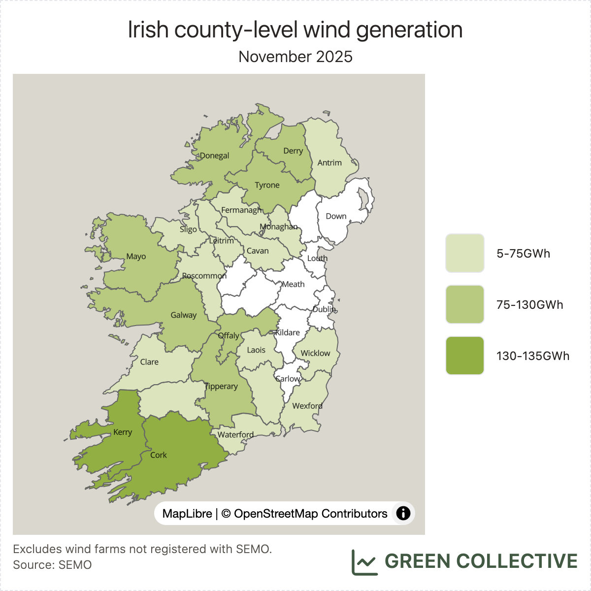 As usual, Kerry and Cork take top spots for wind generation. This month, Offaly claims #3: Yellow River was back in continuous operation – albeit seemingly capped well below its maximum of 75MW at about 50MW – and the new Cushaling Wind Farm continued to operate at full tilt, having first started doing so during October. Galway and Derry are regulars here (Derry only since August 2025 but now a solid one) and regular readers will realise Mayo is absent: Oweninny, the island's largest wind farm, was operating at less than half capacity towards the end of the month. With Offaly and Derry having added significant capacity in recent months, any hiccup at Mayo's only large wind farm is more and more likely to knock Mayo out of the top #5.