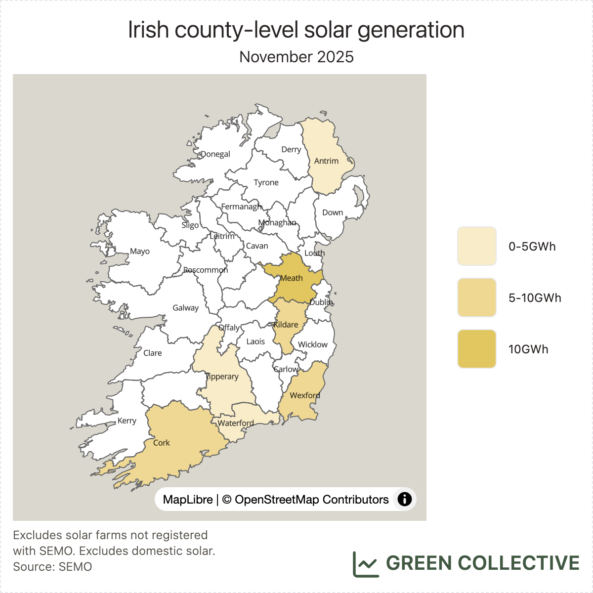 These top three counties each month have been virtually unchanged in 2025 with only the occasional appearance of Kildare at #3, ousting Cork. We're keeping an eye on Drombeg Solar in Kerry – the county's first large-scale solar farm – which appeared in SEMO's publications as far back as August but still hasn't exported to the grid.
