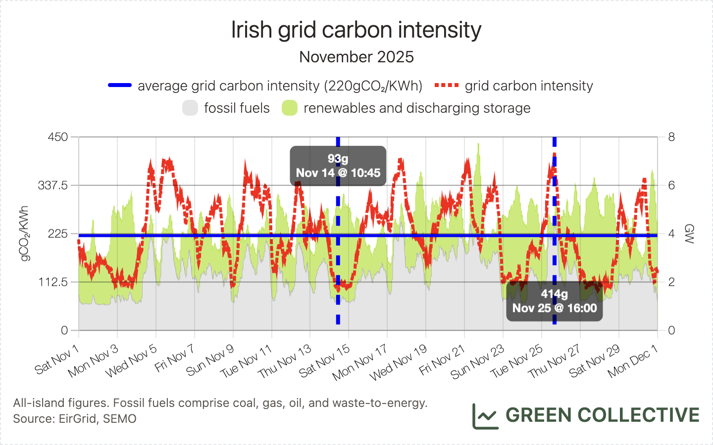We estimate that during November 2025 the Irish grid emitted approximately 695,000 tonnes of CO₂, emitting between 93g and 414g of CO₂ for each kWh of electricity generated for an average grid carbon intensity of 220gCO₂/KWh.